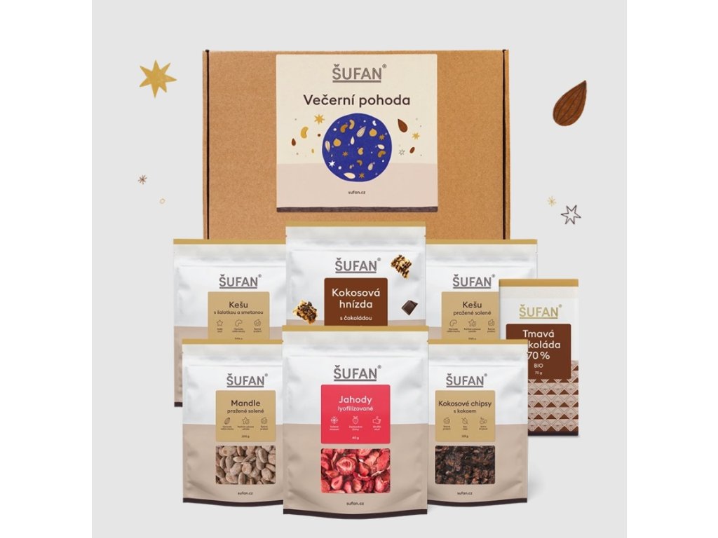V případě slaných choutek vás tento set zachrání praženými kešu nebo mandlemi poprášenými pudrovou solí či překvapí netradiční chutí kešu s šalotkou a smetanou. Sladkou vlnou hravě proplujete s kokosovými čoko hnízdy a naší tmavou tabulkovou čokoládou. Klasické chipsy vyměňte za ty kokosové s kakaem a nezapomeňte vyzkoušet i příjemně sladké jahodové plátky, které mohou před Večerníčkem chroupat i ti nejmenší společníci.