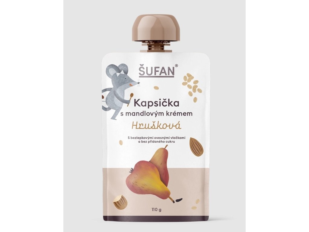 Hruškové pyré 62‚5 %, ovesná kaše (voda, ovesné vločky bezlepkové 2‚5 %), mandlová pasta 12‚5 %.
