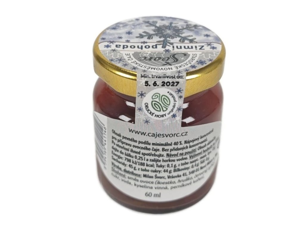 Složení: směs ovoce (švestka, hruška, červený rybíz), cukr, voda, kyselina vinná, perníkové koření.