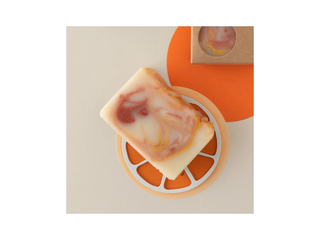 Kokosový olej, olivový olej, bambucké máslo, esenciální olej Pomeranč, přírodní minerální oxidy Ingredients: Sodium Cocoate, Aqua, Sodium Olivate, Citrus Aurantium Dulcis Oil, Butyrospermum Parkii Butter, CI 77491 (přírodní minerální oxid), CI 77492 (přírodní minerální oxid), *Limonene, *Linalool (*přírozená součást esenciálních olejů)